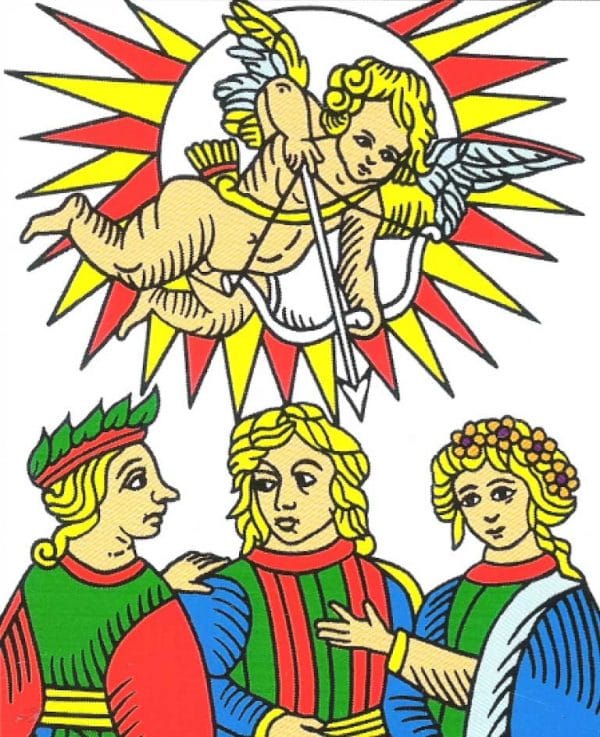 Pero ahora, teniendo en cuenta el arcano número seis del Tarot de Marsella, nos encontramos en una encrucijada nada fácil de sortear. El muchacho joven, símbolo de la incipiente conciencia, que representa tanto a hombres como a mujeres, está en un conflicto, duda por dónde debe caminar.